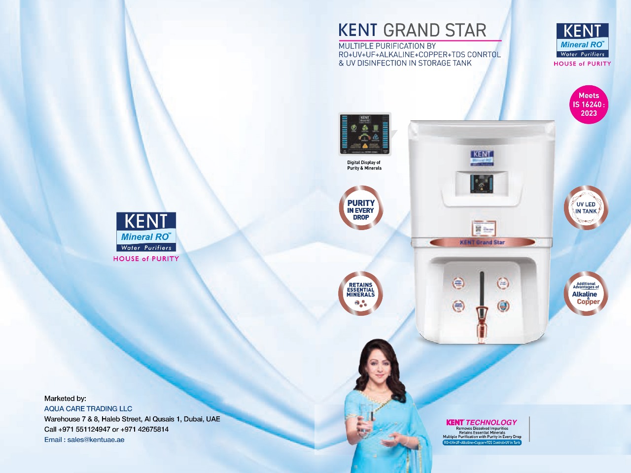 Equipped with Mineral RO™ Technology, KENT Grand Star retains essential natural minerals, enhancing both the taste and health benefits of your water. Its innovative Digital Display of Purity lets you monitor real-time water quality, filter life, and UV intensity — giving you complete control and confidence over every drop you drink.